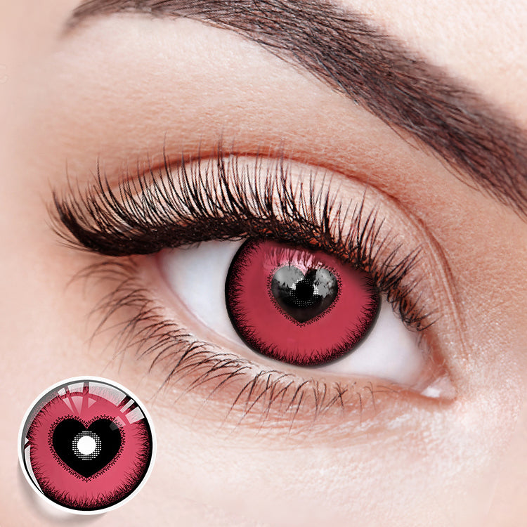 The design inspiration for Sweetheart Pink Charm Contact Lenses is drawn from sweet love hearts. These lenses feature a pink background with a black heart in the center, surrounded by scattered black patterns. This design aims to convey an atmosphere of love and tenderness, with pink symbolizing romance and gentleness, while the black heart and surrounding patterns add a touch of mystery and visual appeal. Wearing these contact lenses will make your eyes exude a charming allure reminiscent of a sweet love heart.